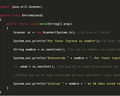 La clase Scanner de la librería java.util es también muy sencilla para obtener datos de entrada del usuario, a diferencia de BufferedReader, Scanner si posee un método para la lectura de números y para la lectura de texto que nos ayudarán a facilitar un poco las cosas.